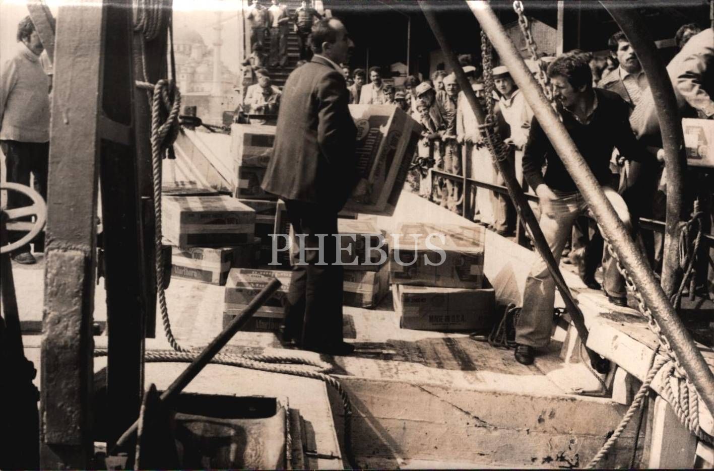Bir operasyonla gemiden Galata Köprüsü´ne indirilen kaçak Marlboro kolileri, arka yüzü "Demokrat Arşiv Servisi" ve "Türk Haberler Ajansı" damgalı, 18x12 cm