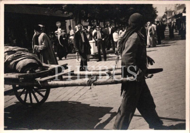 Yük arabasıyla mal taşıyan bir hamal, 10x7 cm