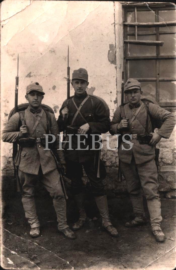 Silahlarıyla poz veren üç adet askerin arka yüzü ithaflı ve imzalı hatıra fotoğrafı, 9x14 cm