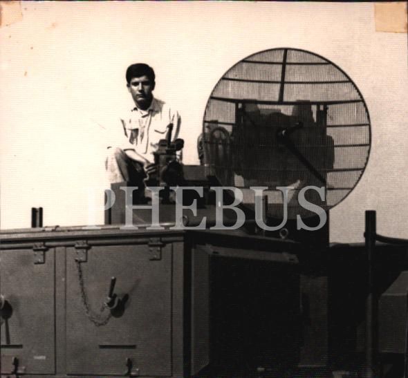 Askerî aracın tepesinde poz vermiş bir asker, 7,5x7 cm