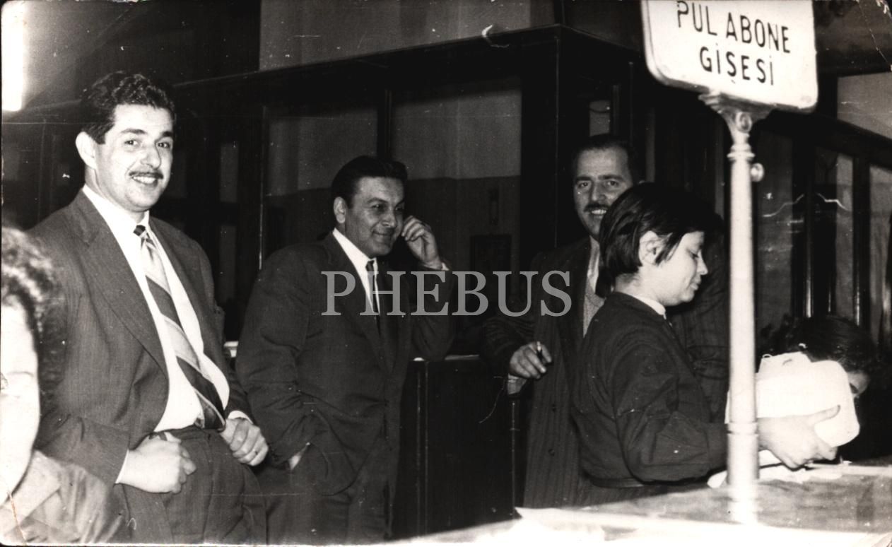 "Pul Abone Gişesi" önünde poz veren postahane çalışanları, 16x10 cm