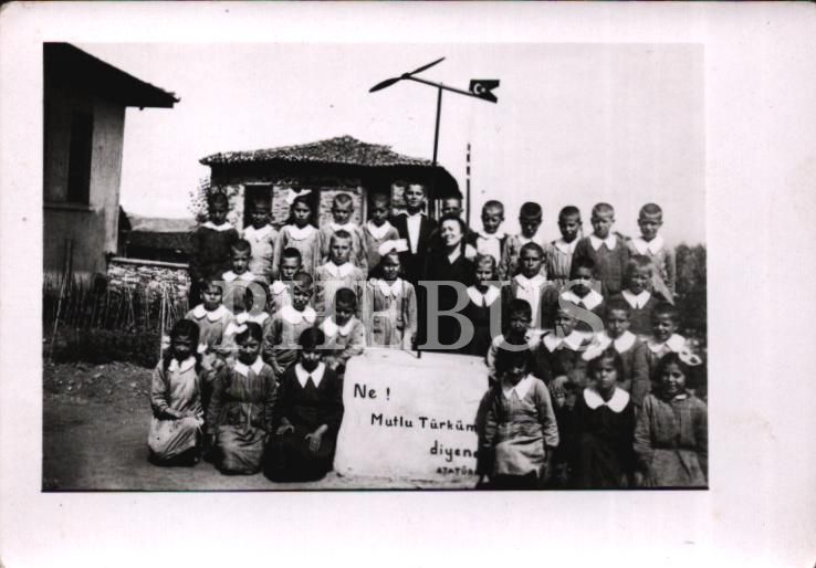 "Ne Mutlu Türküm Diyene - Atatürk" yazılı pankartın çevresinde hatıra fotoğrafı çektiren öğrenciler ile öğretmenleri, 10x7 cm