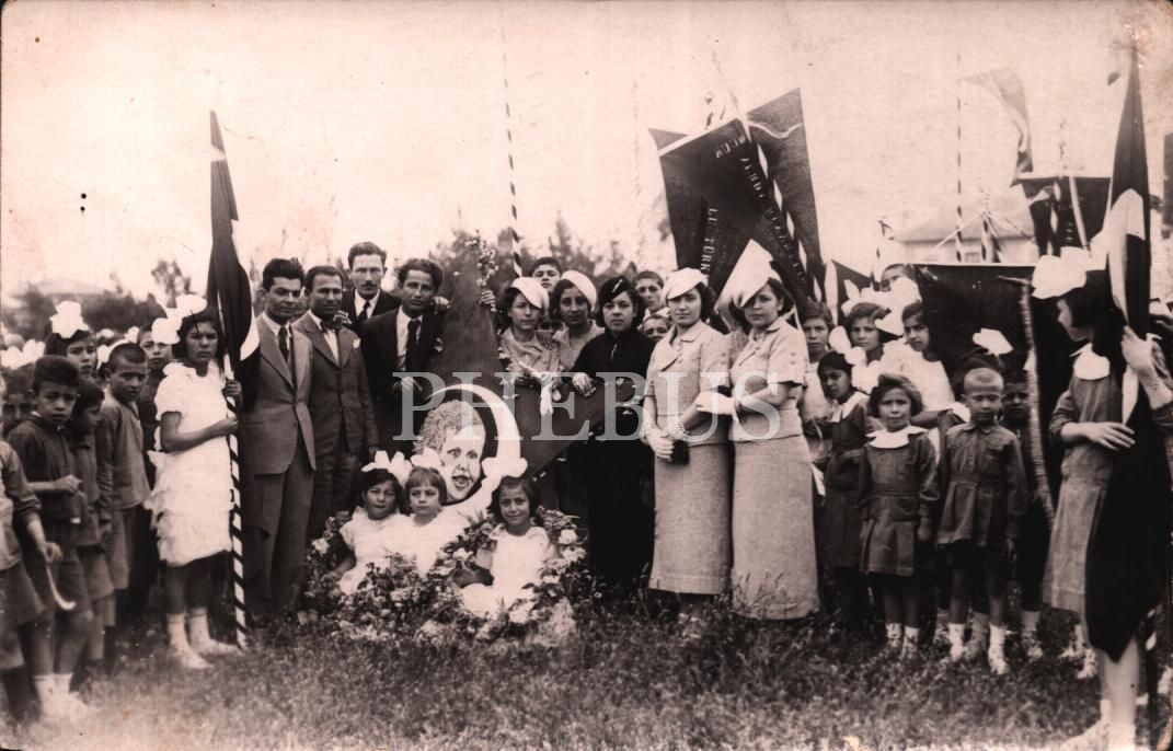 Bir millî bayramda Türk bayrakları ve okul flamalarıyla törene hazırlanan öğrenci ve öğretmenler, 14x9 cm