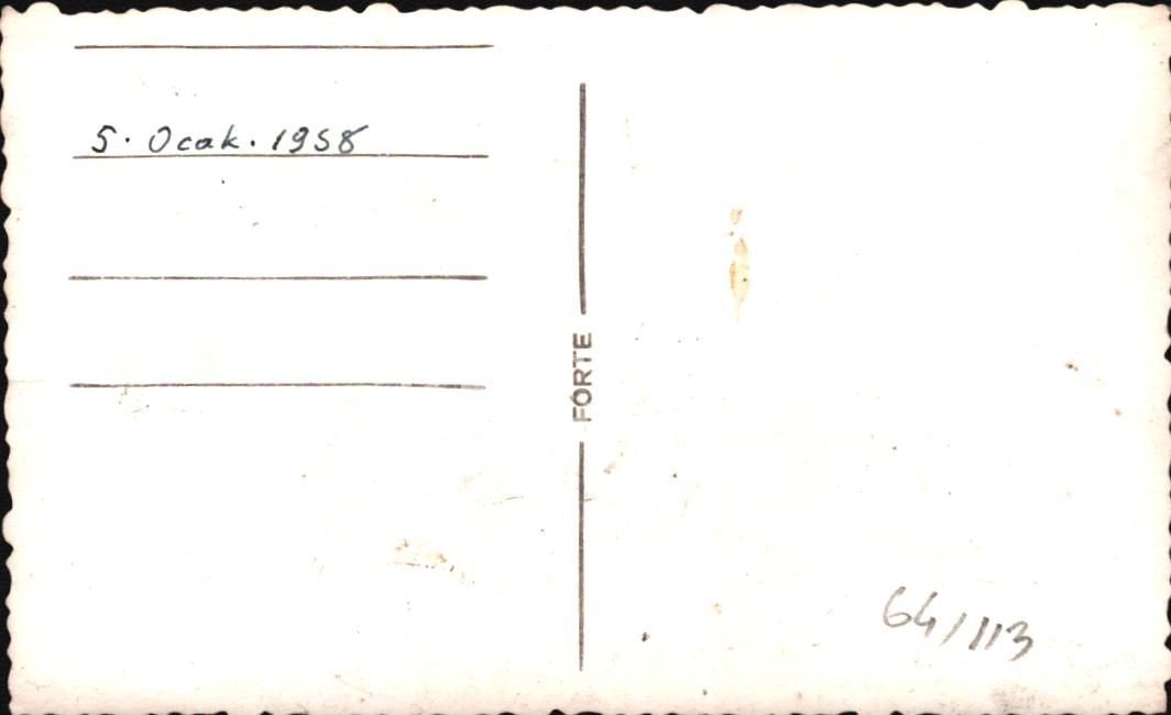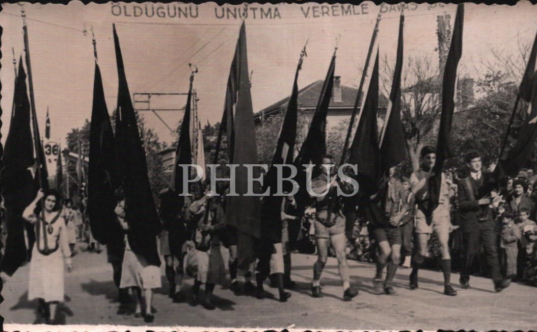 Ellerinde Türk bayraklarıyla "Öldüğünü Unutma Veremle Savaş" pankartının altından geçen öğrenciler, 5 Ocak 1958, 13x8 cm