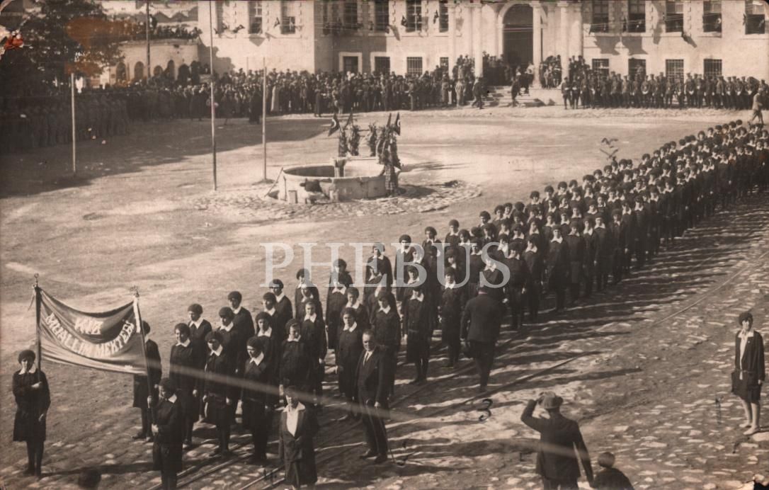 "Kız Muallim Mektebi" flamasıyla yürüyüş yapan öğrenciler, 1928, arka yüzü açıklamalı, 14x9 cm