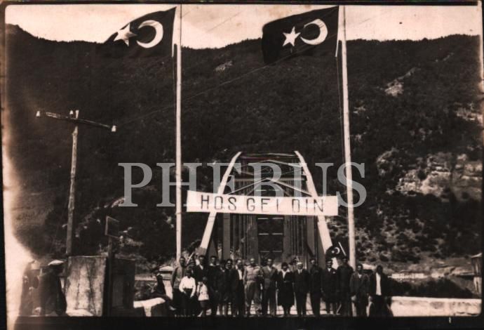 "Hoş Geldin" yazılı sınır bölgesinde, Türk bayraklarının gölgesi altında poz veren topluluk, 9x6 cm