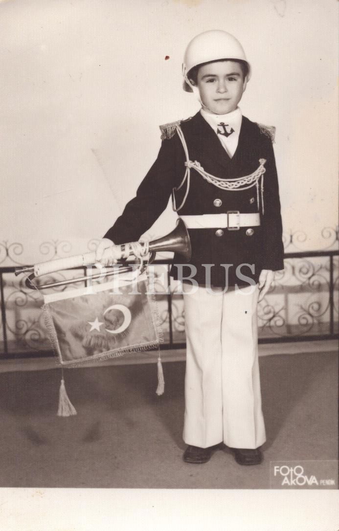 Denizci üniformalı ve borazanlı çocuğun arka yüzü ithaflı ve imzalı, 1977 tarihli hatıra fotoğrafı, Foto Akova / Pendik, 9x14 cm