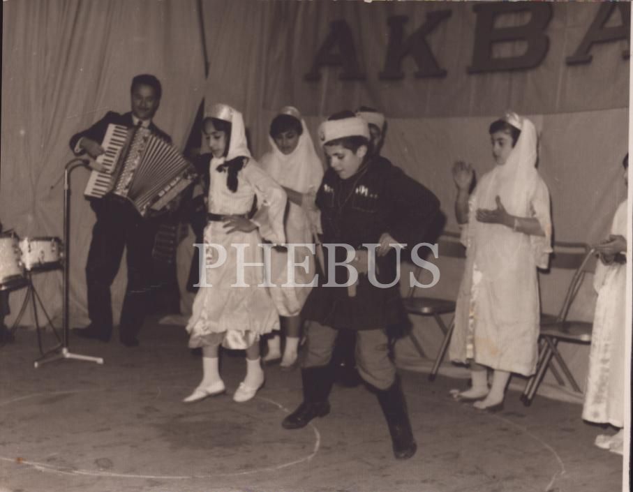 "Akbank" yazılı sahnede müzik eşliğinde dans eden yöresel kıyafetli çocuklar, 12x9 cm