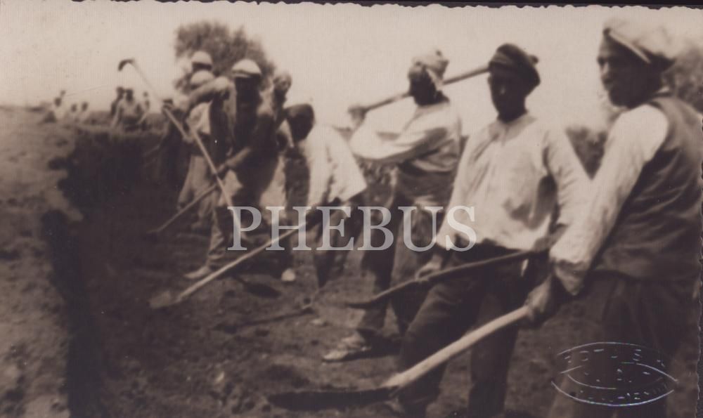 Kazma küreklerle kazı yapan İzmitliler, "Foto Şık / M. Halit / İzmit" soğuk damgalı, 13x8 cm