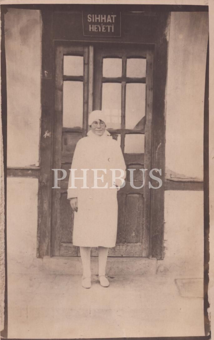 "Sıhhat Heyeti" tabelalı kapı önünde hatıra fotoğrafı, 9x14 cm