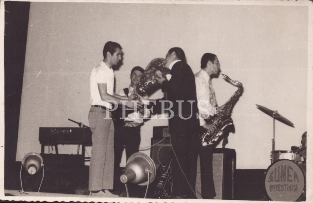 Malatya Sümer Orkestrası sahnede, arka yüzü "Foto Spor / Malatya" damgalı, 14x9 cm