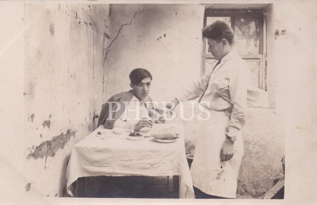Tek başına rakı sofrasına kurulmuş melankolik genç ile kendisine sakilik yapan arkadaşı, 14x9 cm