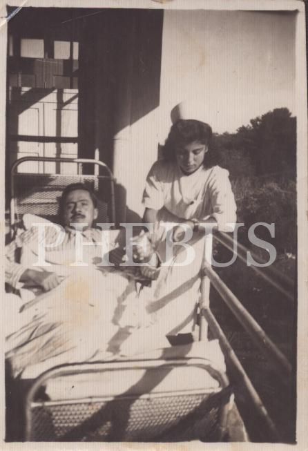 Kendisiyle ilgilenen hemşireyle hatıra fotoğrafı çektiren beyefendi, arka yüzü ithaflı ve imzalı, 6x8 cm