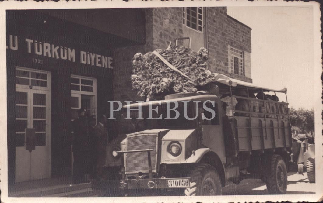 Giriş kapısında "Ne Mutlu Türküm Diyene" yazan askerî binadan uğurlanan askerler, 14x9 cm