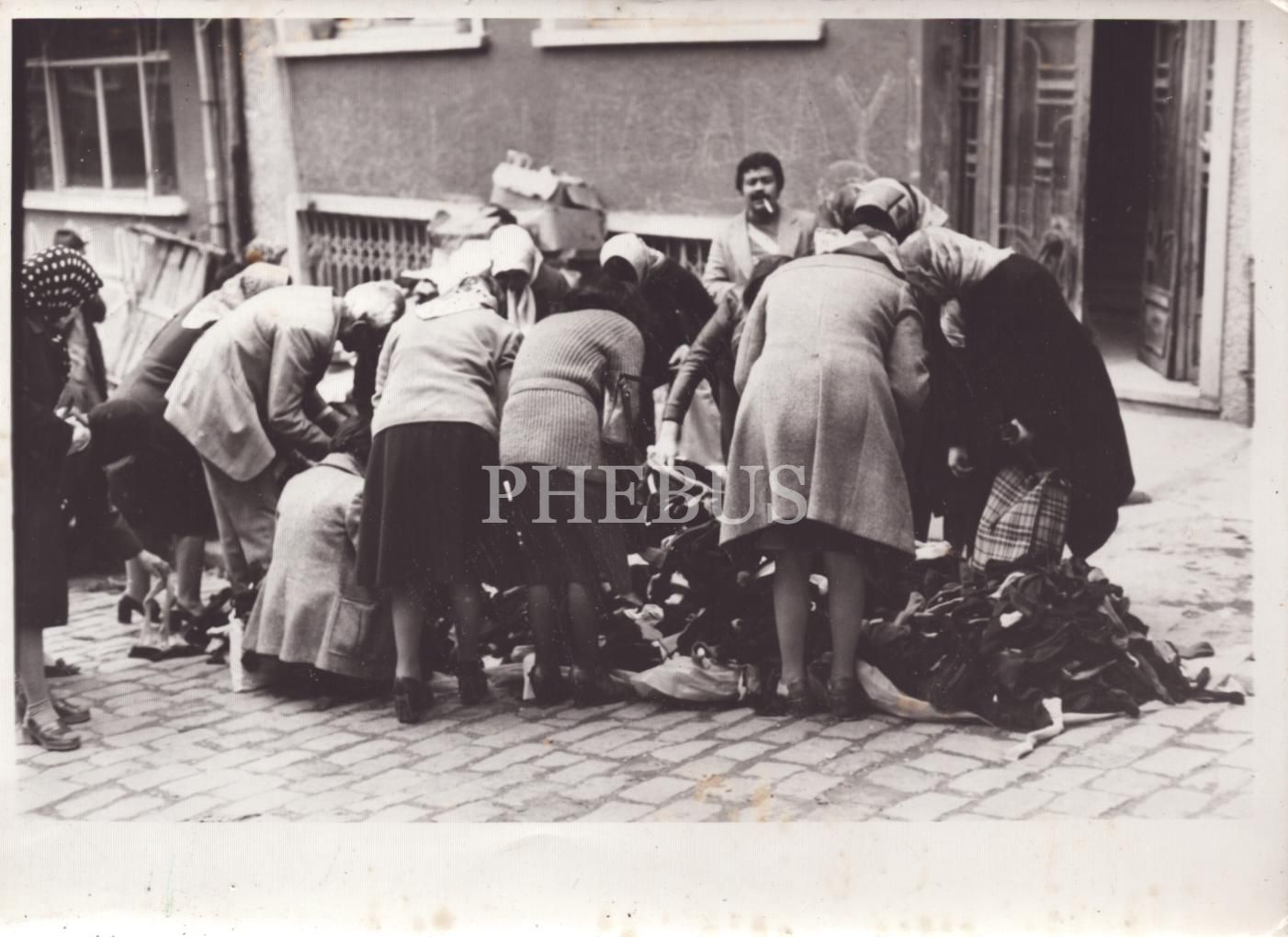 Sokak ortasında satılan kıyafetlere hücum eden mahalle halkı, 18x12 cm