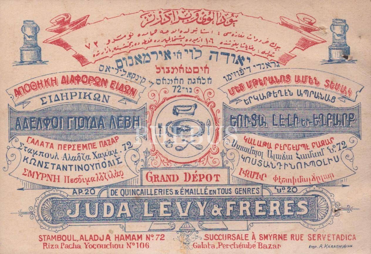 Juda Levy Freres (Yuda Levi ve Biraderleri)´ne ait Osmanlıca-İbranice-Ermenice-Rumca-Fransızca işyeri kartı, Smyrne(İzmir) 11x16 cm