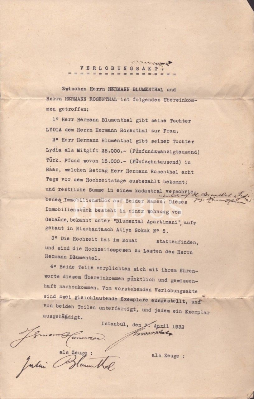 Hermann Blumenthal ve Lydia Rosenthal´in düğününe ait Almanca evlilik anlaşması, ıslak imzalı, 7 Nisan 1932, 21x33 cm