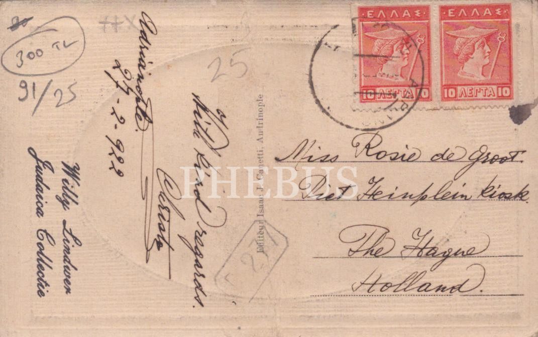 Gofre Edirne Sinagog kartpostalı, Yunan pulları ile Hollanda´ya gönderilmiş kart
