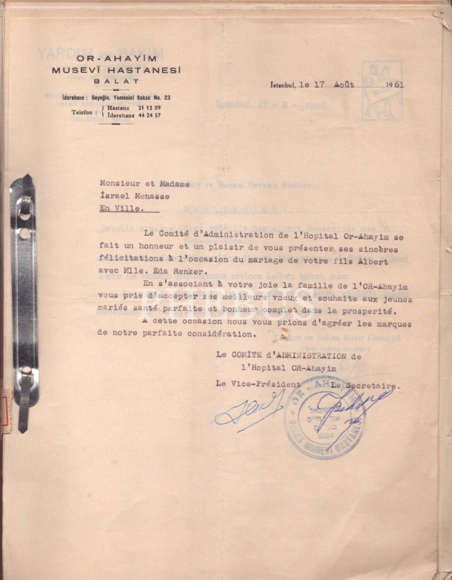 Yerleşik olarak faaliyet gösteren Yahudi cemaat ile ilgili kuruluşlar ve yardım cemiyetleri tarafından İsrael Menase´ye gönderilmiş, Ladino, Fransızca ve Türkçe tebrik mektupları, 1961