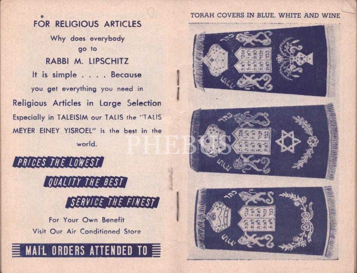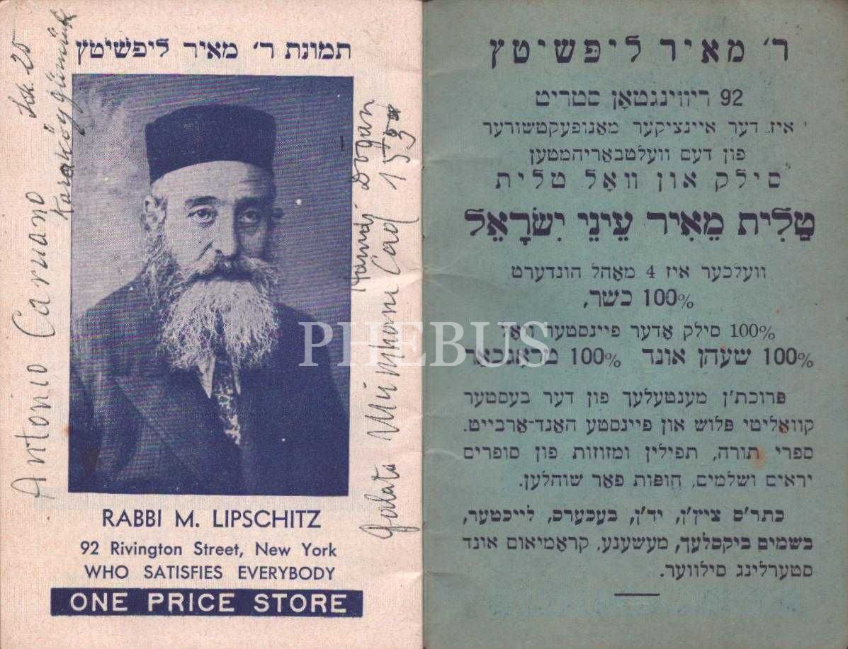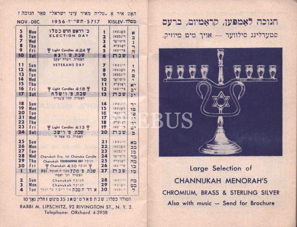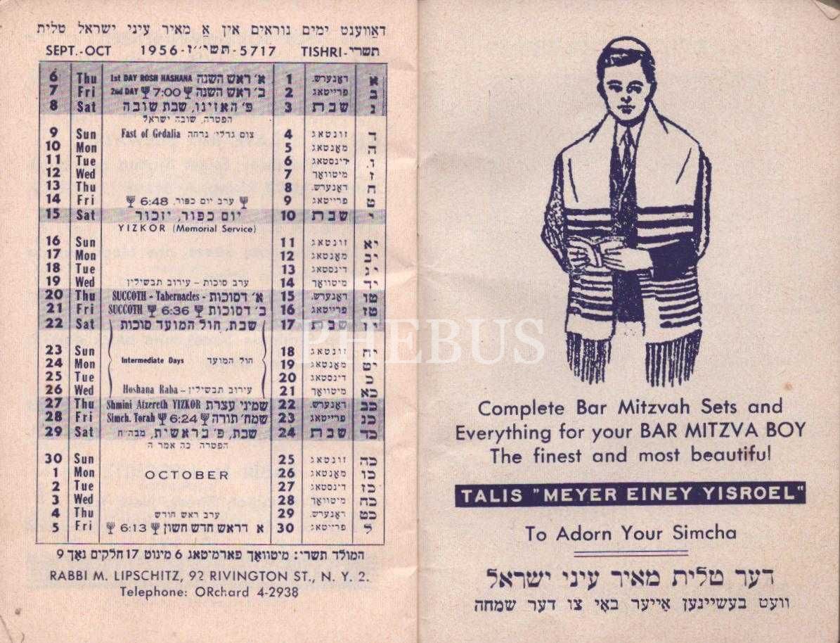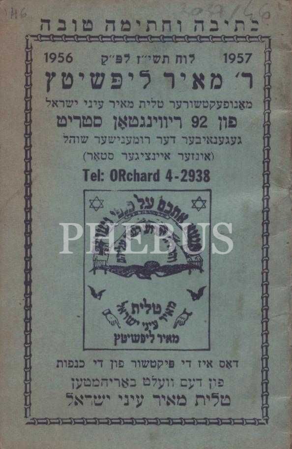Rabbi Meir Lipschitz onuruna basılmış, künye sayfasında büyük boy resmi olan, kapak sayfası Yiddish yazılı 1956 yılı halilası [takvim], 8x12 cm
