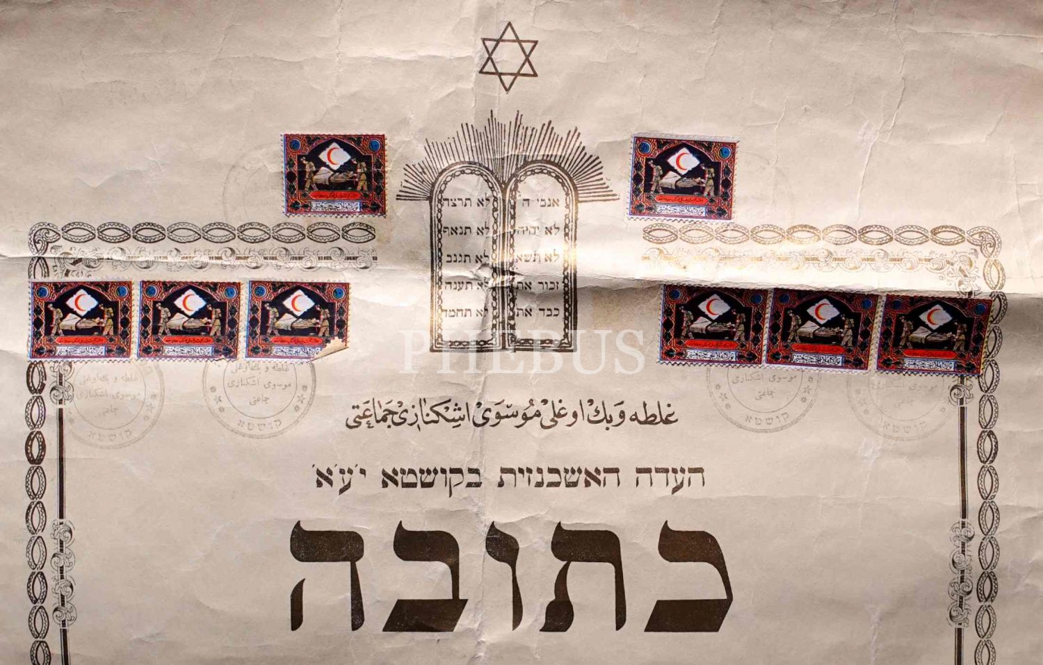 Galata Beyoğlu Musevi Eşkenazim Cemaati matbu ketuba (İbranice evlilik akdi), 21 2. Adar 5687/12.6.1932, Osmanlı Hilal-i Ahmer Cemiyeti yardım pullu, 37x49 cm