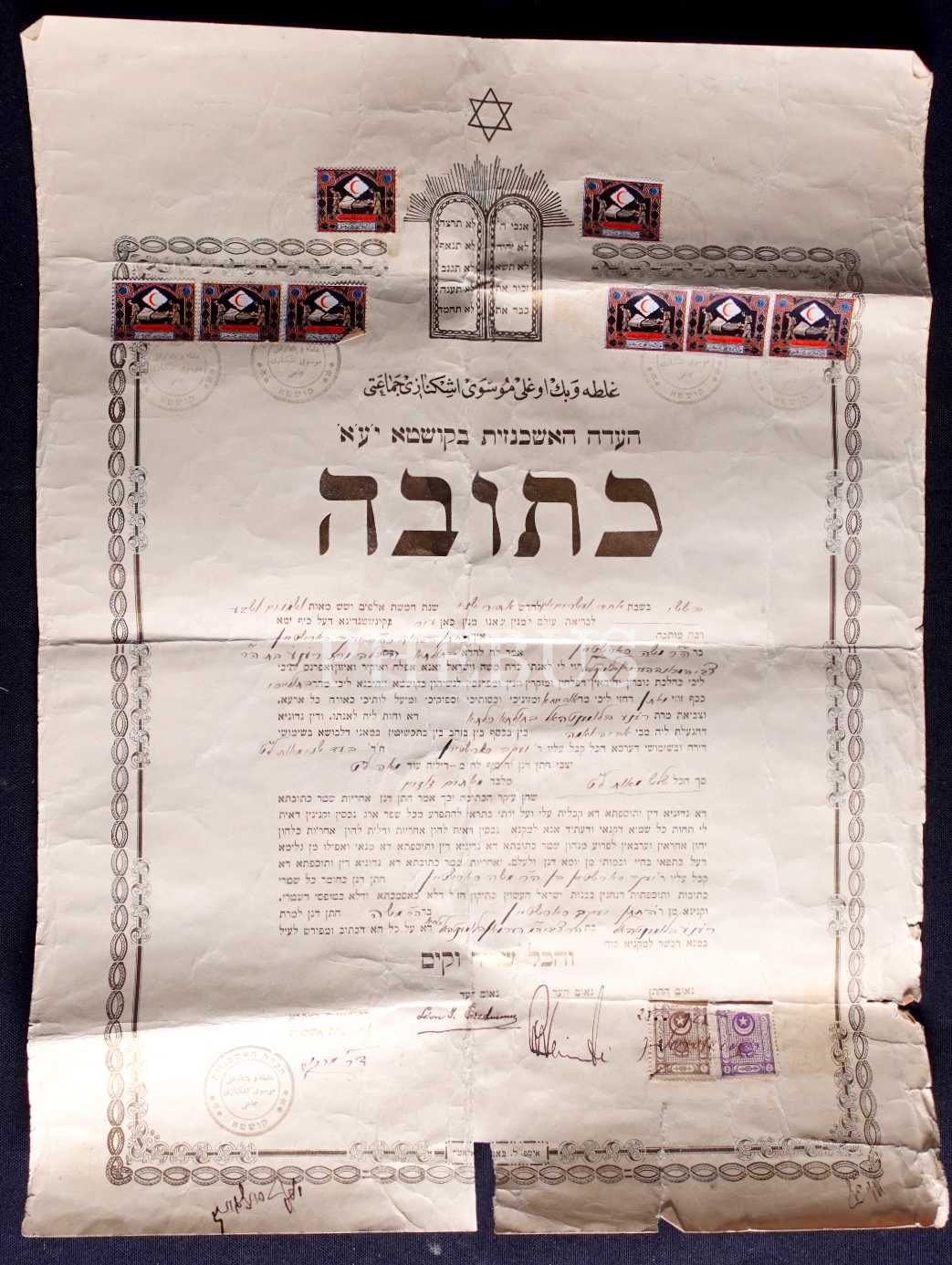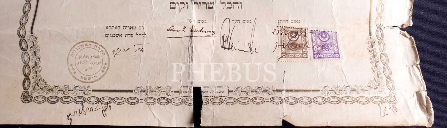 Eşkenaz Rabbisi olan Dr. Marcus imzası mevcut olup, Yeşa Sorstein ve Ra´ana Blumental´e ait evlilik sözleşmesidir. Osmanlı fiskallerinin üzerinde damada ve 2 farklı şahite ait imza bulunmaktadır
