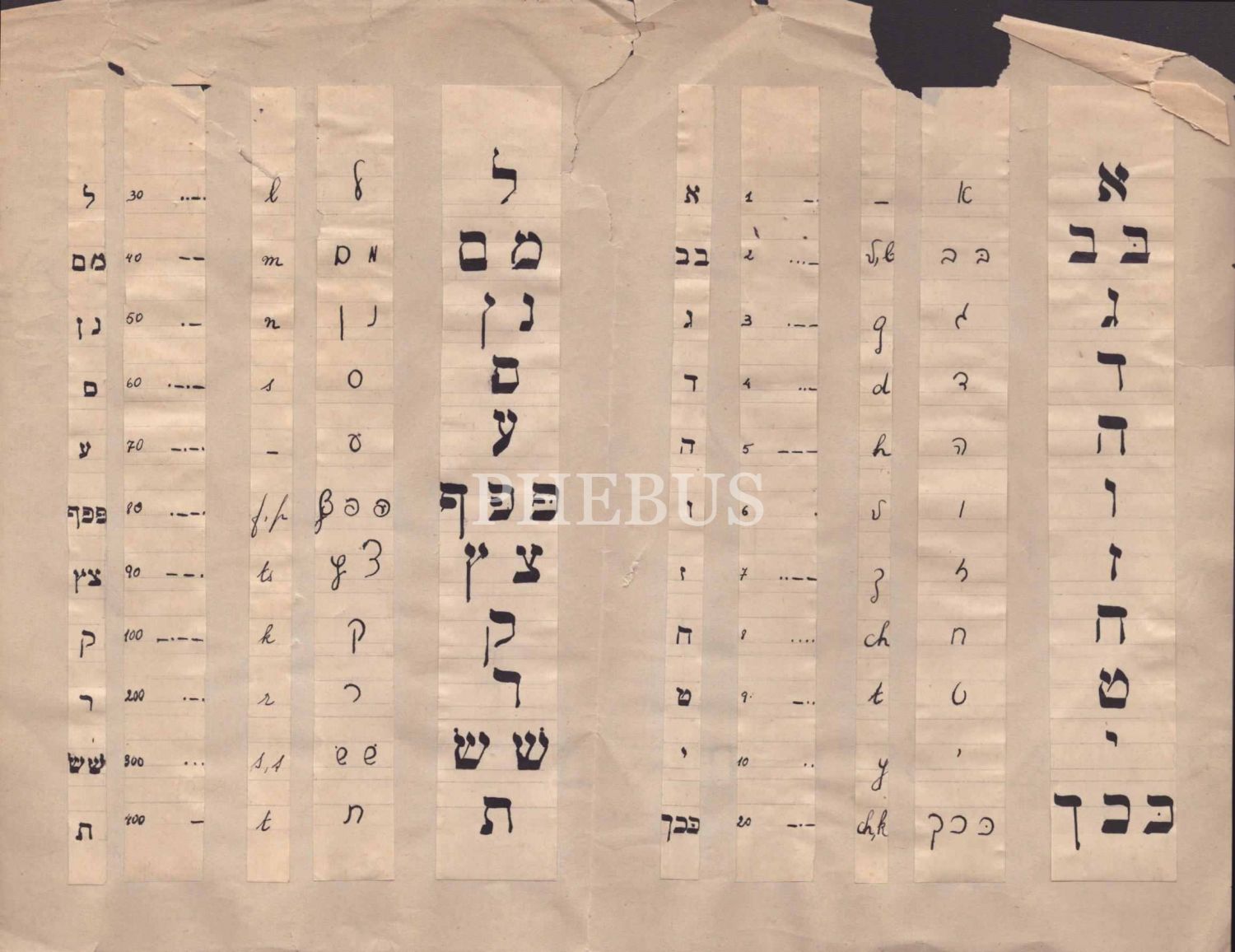 Elifba: İbrani harflerinin matbu ve elle yazılmış biçimleri, Latin harfli karşılıkları, noktalama şifresi ve ebced hesabı (kâğıt üzeri ön prova çalışması), 23x30 cm