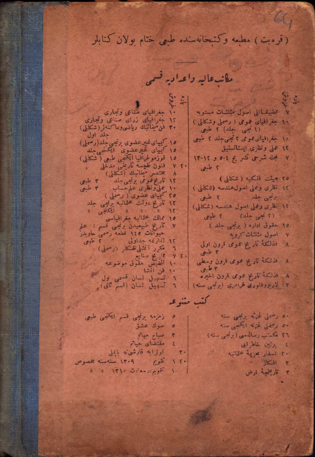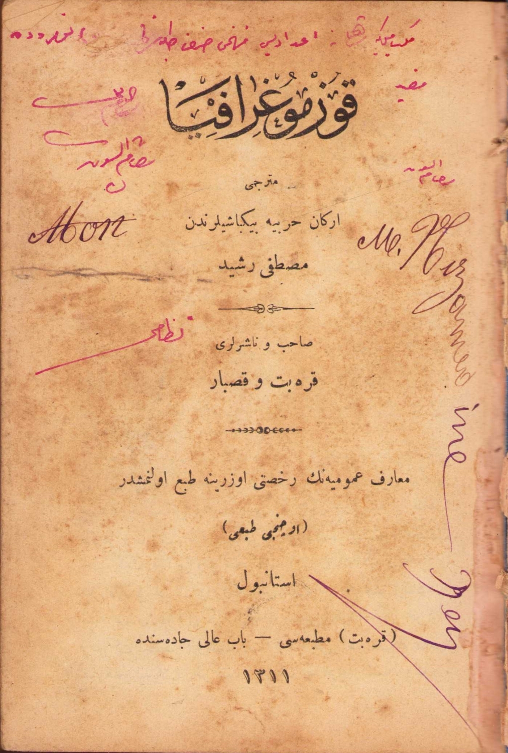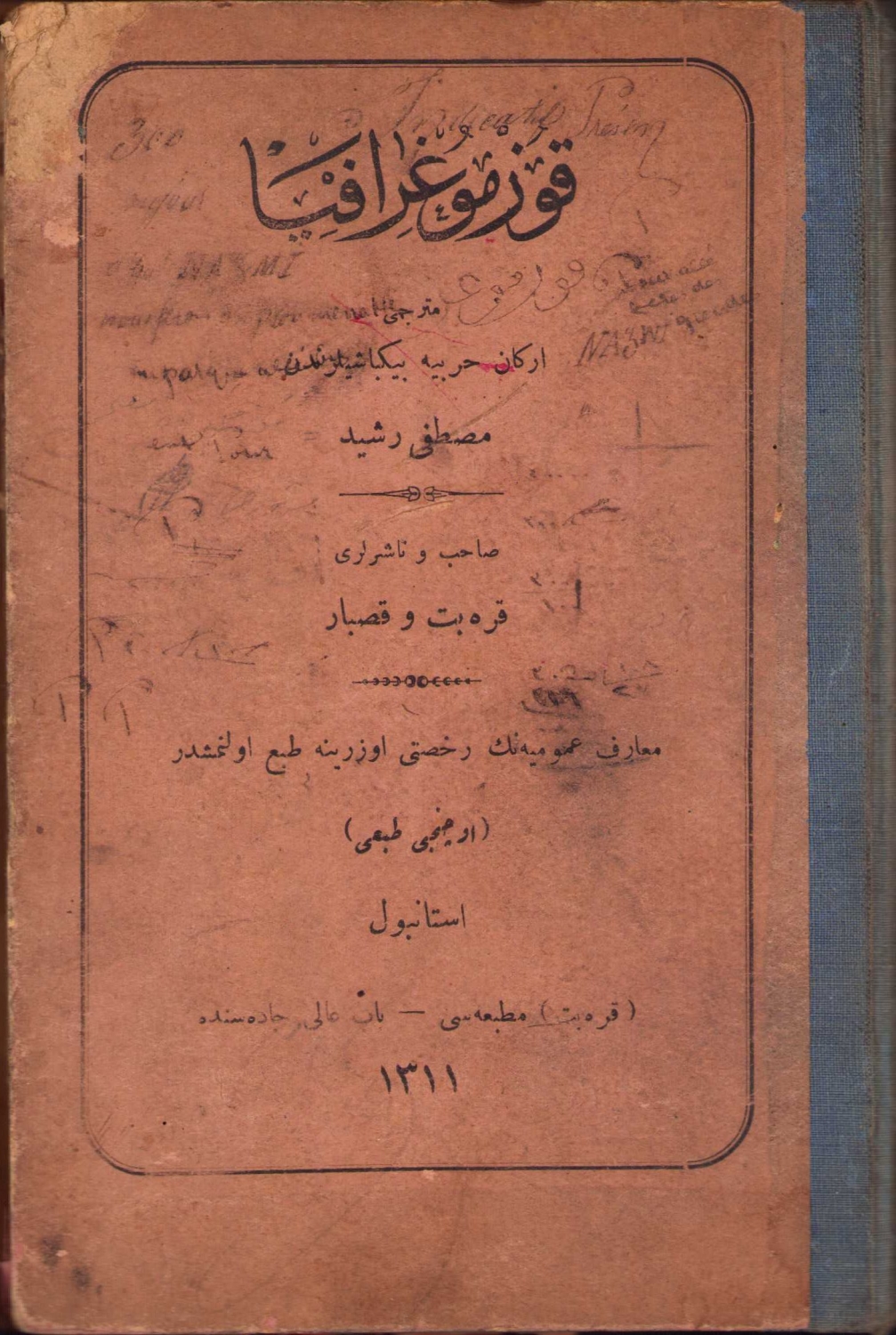Osmanlıca Kozmografya, çev., Mustafa Reşit, Karabet Matbaası, İstanbul, 1311, 132 şekil mevcut, 376 sayfa, 12x18 cm, ÖZEGE; 18299,
