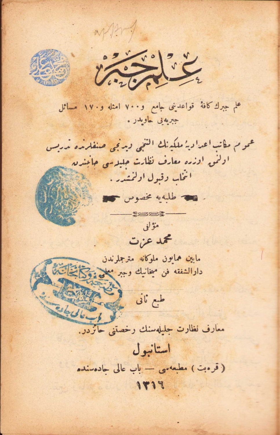 Osmanlıca İlm-i Cebir. Taşra Mekâtib-i İdadiyesinin 6. ve 7. Sınıflarında Tedris Olunmak Üzere, Mehmed İzzet,