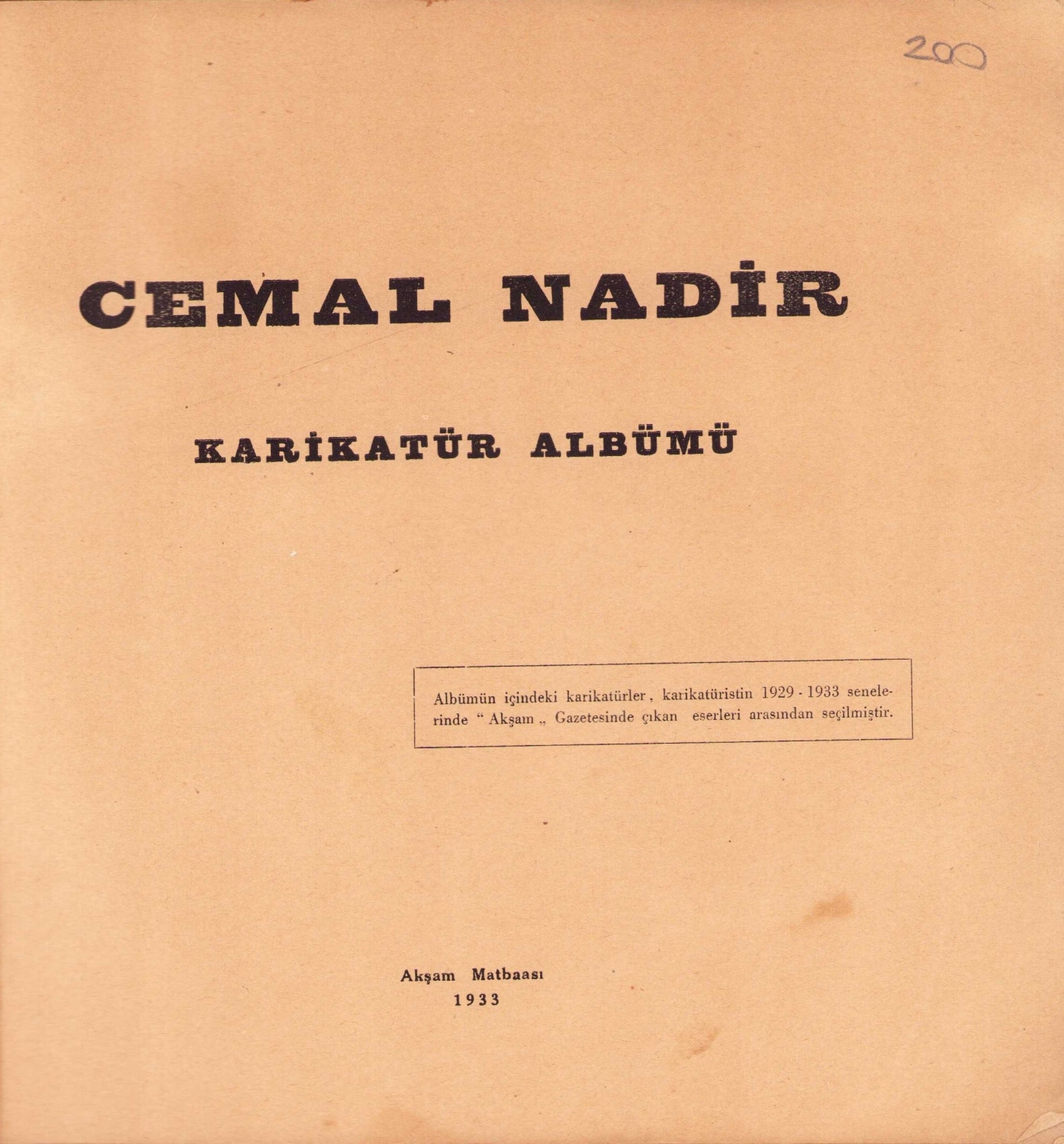 Cemal Nadir Karikatür Albümü, Akşam Matbaası, 1933, kapak haliyle, 66 sayfa, 22x20 cm.
