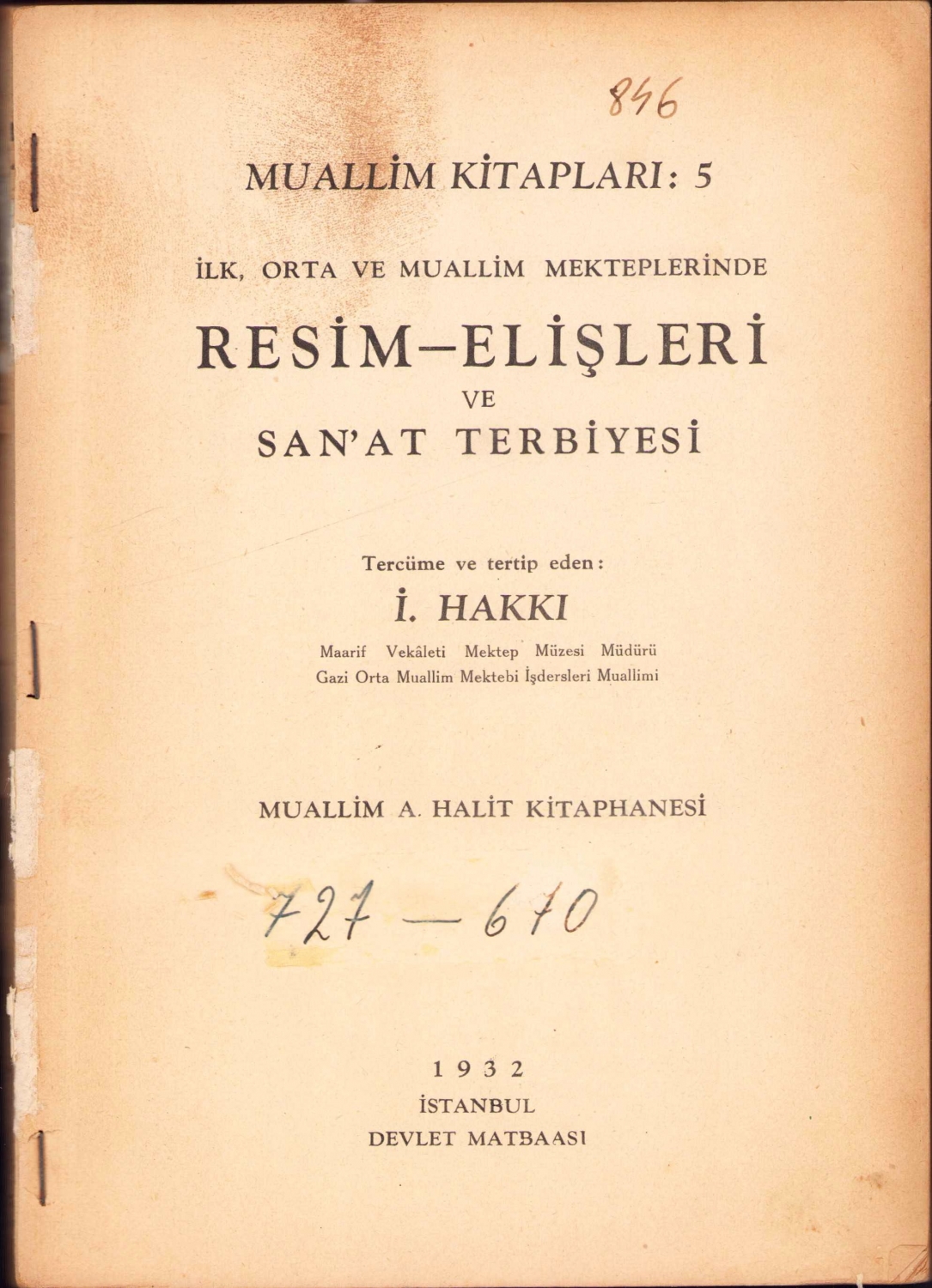 Resim Elişleri ve Sanat Terbiyesi, İbrahim Hakkı, Devlet Matbaası, İstanbul, 1932, 170 resim, 35 levha mevcut, cilt kopuk, 254 sayfa, 16x23 cm.