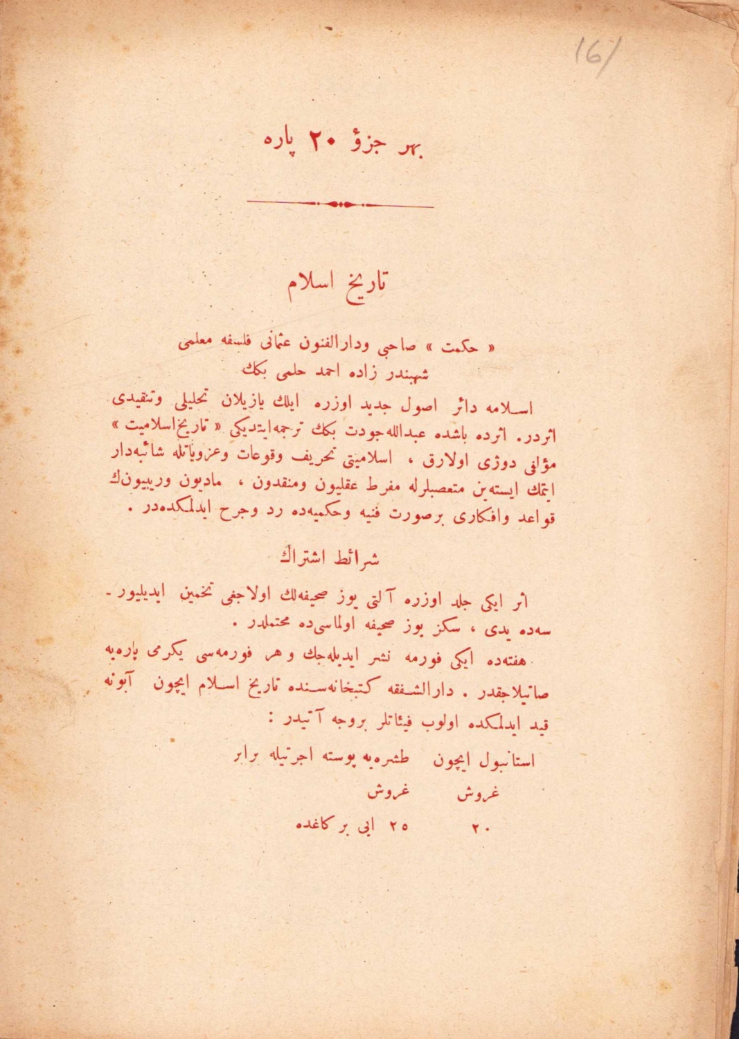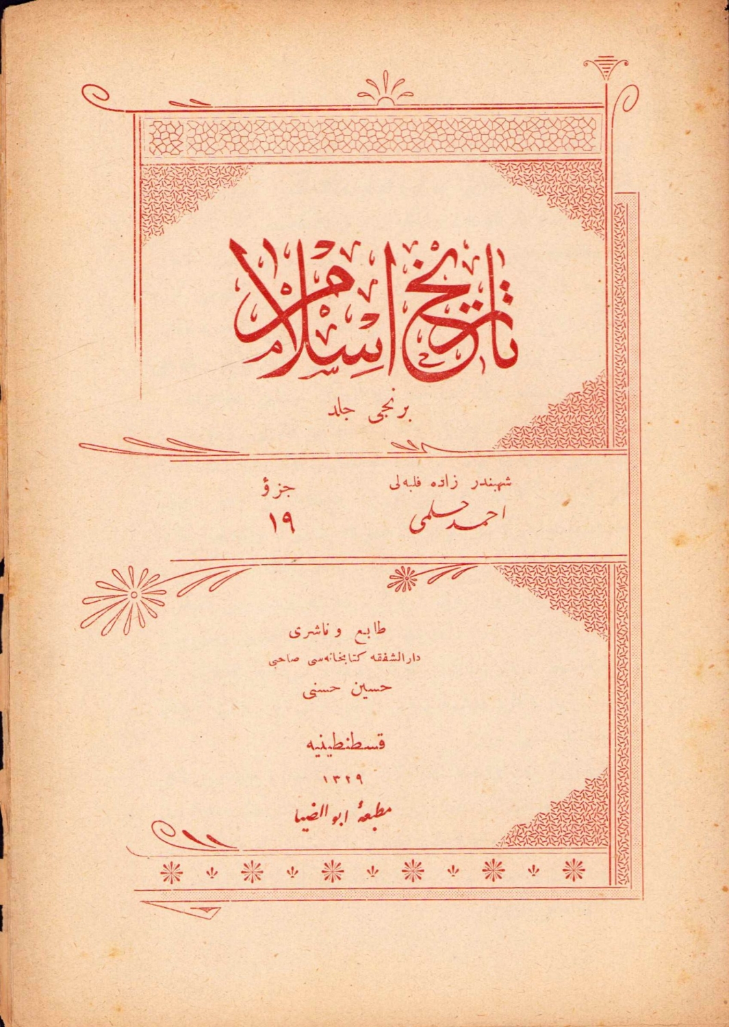 Osmanlıca Tarih-i İslam, cüz 19, Şehbenderzade Filibeli Ahmed Hilmi, Matbaa-i Ebuzziya, Konstantiniye, 1329, 14 sayfa, 14x20 cm.