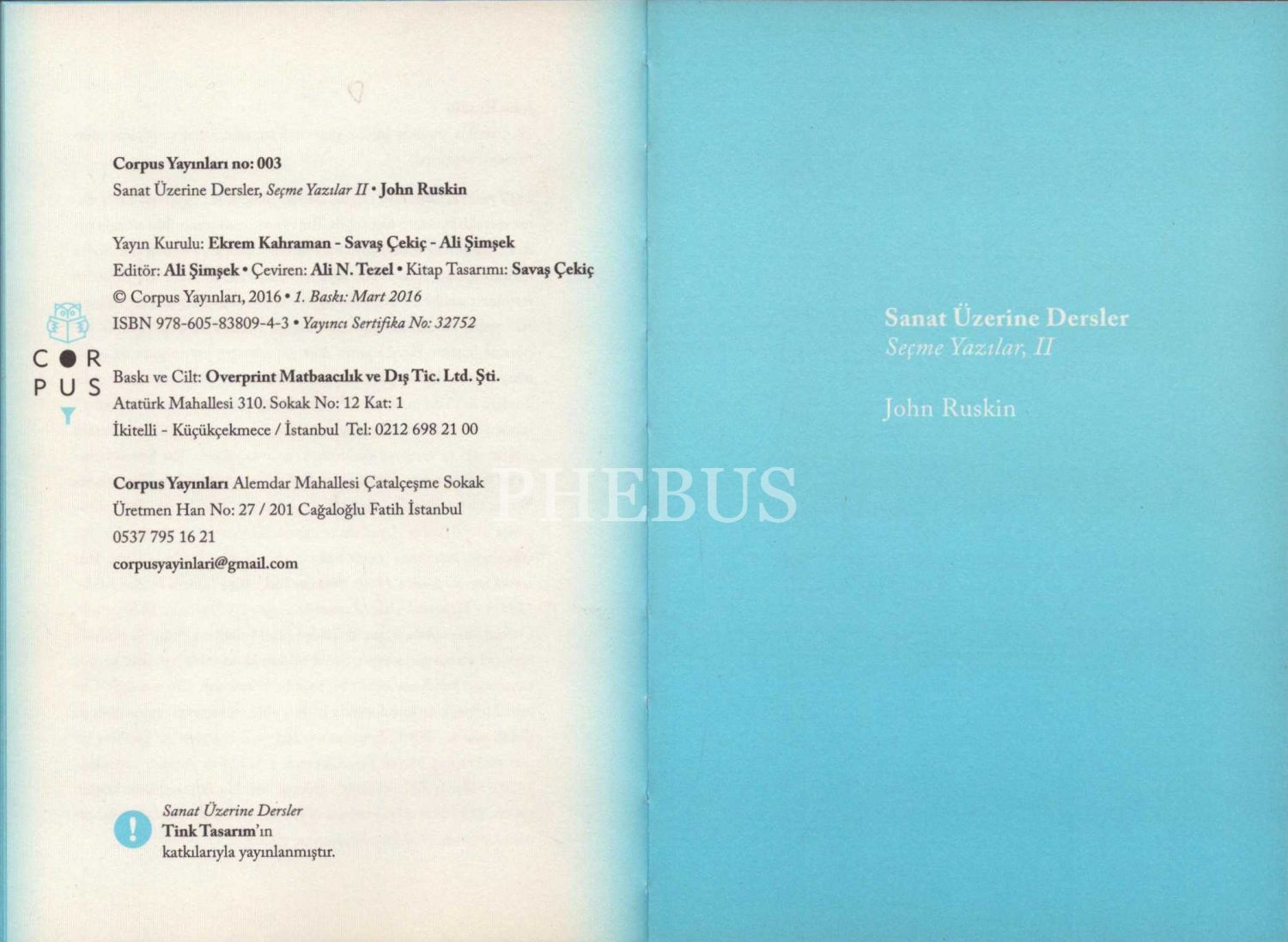 SANAT ÜZERİNE DERSLER / SEÇME YAZILAR 2, John Ruskin, Corpus Yayınları, Mart 2016, 130 sayfa, 14x20 cm