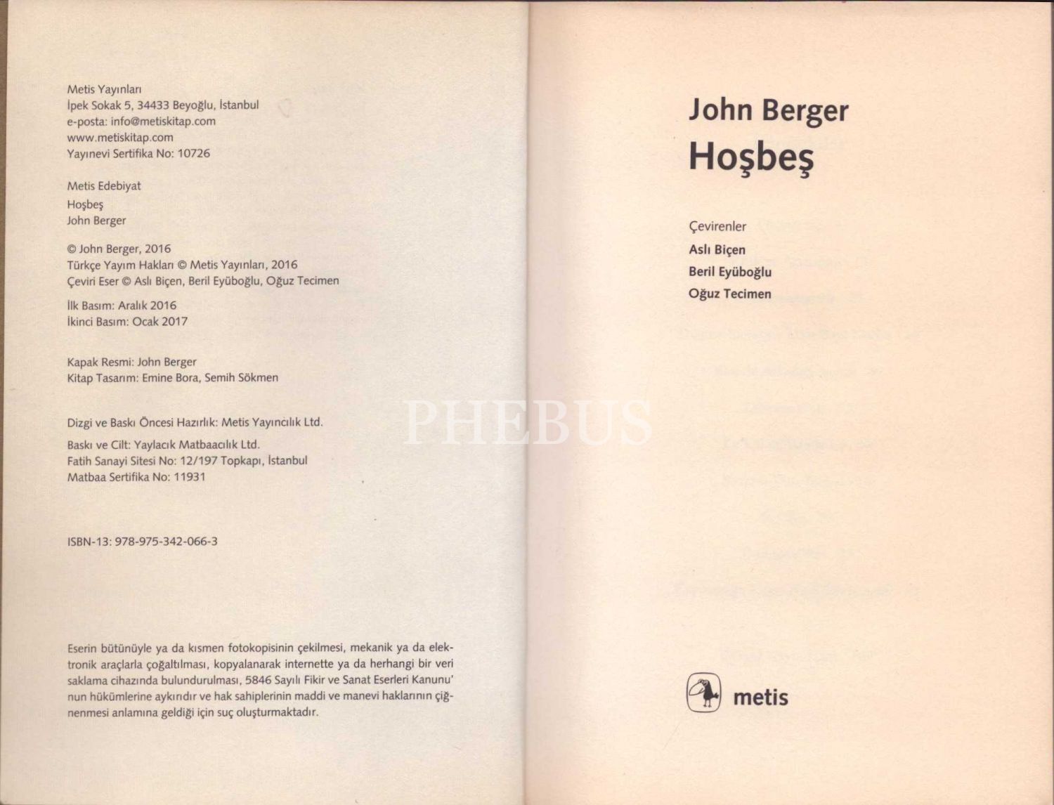 HOŞBEŞ, John Berger, çevirenler: Aslı Biçen - Beril Eyüboğlu - Oğuz Tecimen, Metis Yayınları, Ocak 2017, 104 sayfa, 13x20 cm