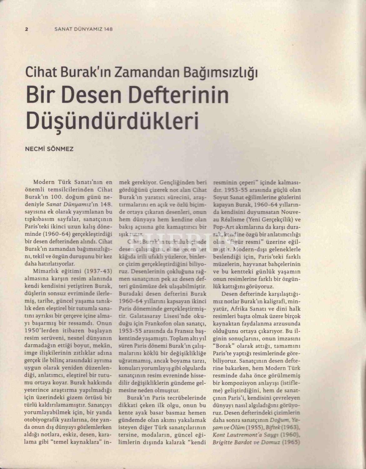 Cihat Burak´ın Zamandan Bağımsızlığı: BİR DESEN DEFTERİNİN DÜŞÜNDÜRDÜKLERİ, Necmi Sönmez, Sanat Dünyamız 148, 2015, 24 sayfa, 22x28 cm