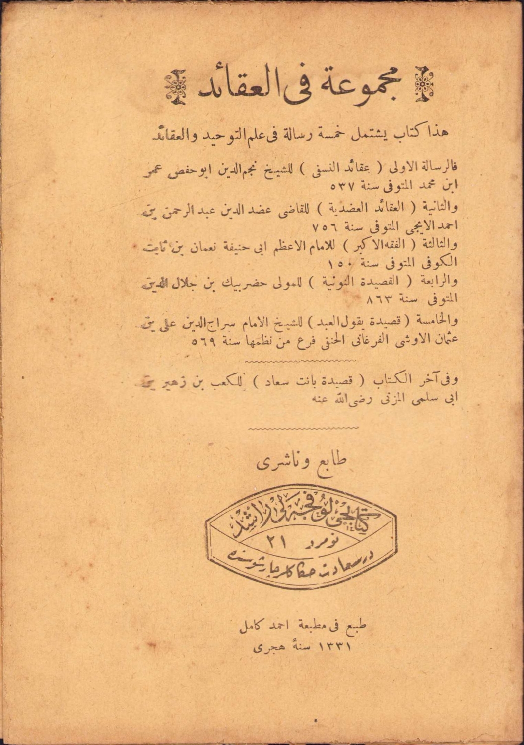 Osmanlıca Mecmuatül Akaid, Ahmed Kamil Matbaası, 1331, 29 sayfa, 12x18 cm.