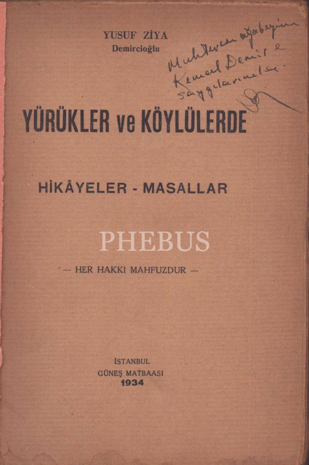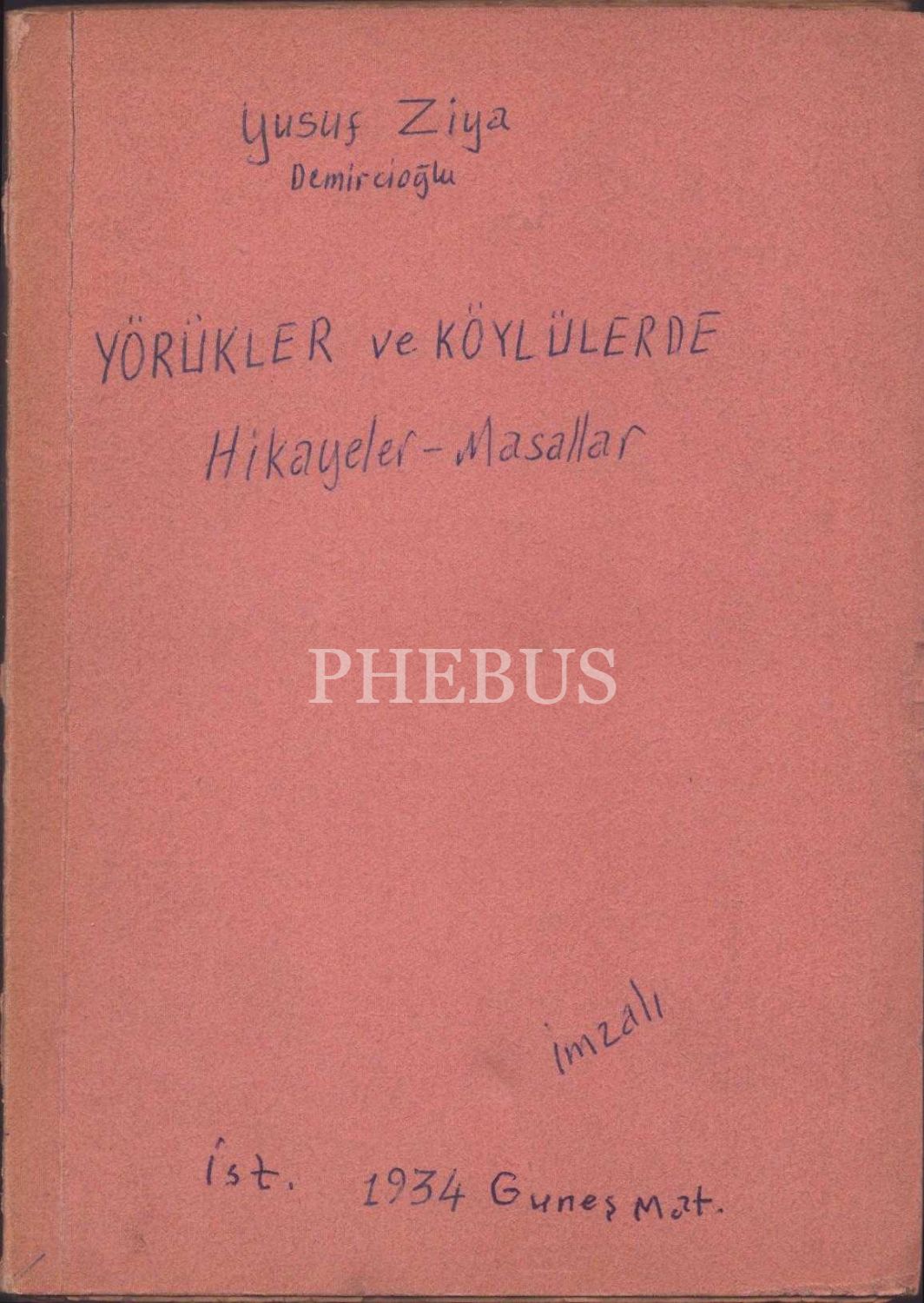 Yusuf Ziya Demircioğlu´dan ithaflı ve imzalı YÖRÜKLER VE KÖYLÜLERDE HİKÂYELER - MASALLAR, Güneş Matbaası, İstanbul - 1934, 192 sayfa, 15x20 cm