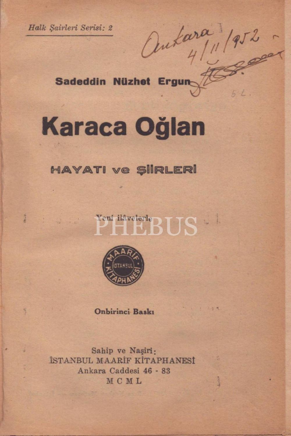 KARACA OĞLAN (Hayatı ve Şiirleri), Sadeddin Nüzhet Ergun, İstanbul Maarif Kitaphanesi, 1950, 400 sayfa, 15x21 cm