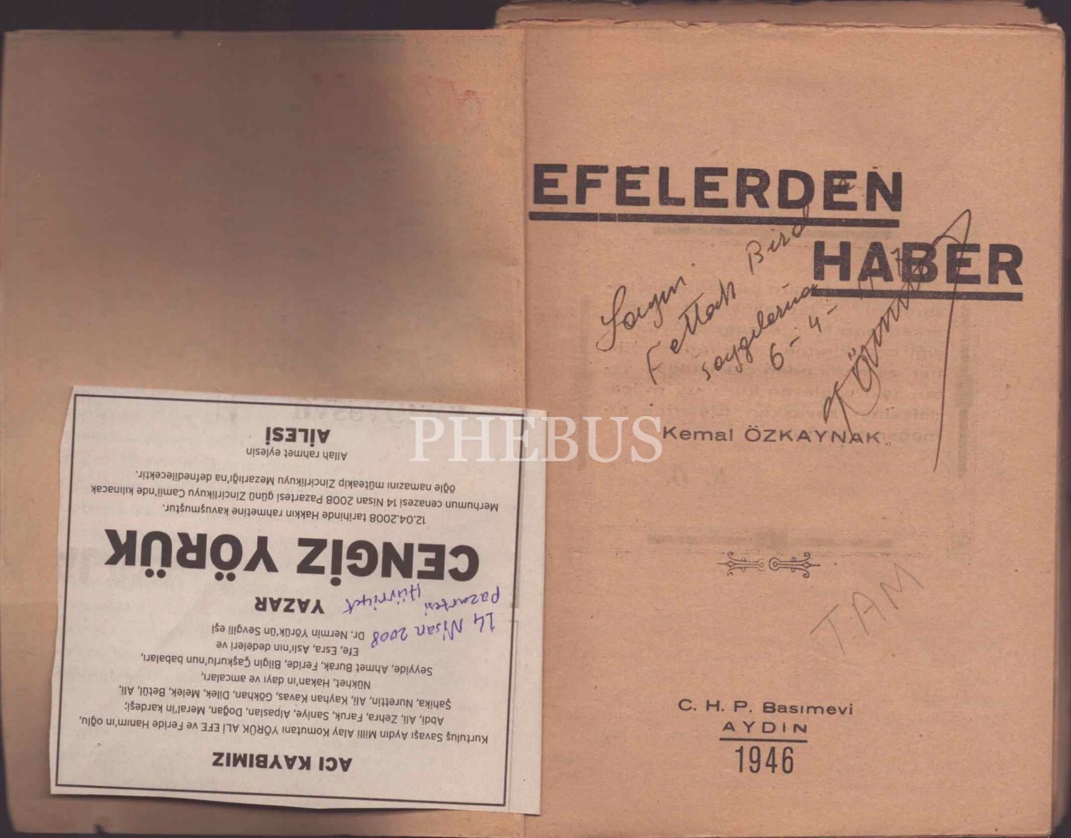 Kemal Özkaynak´tan ithaflı ve imzalı EFELERDEN HABER, C.H.P. Basımevi, Aydın - 1946, 178 sayfa, 15x21 cm