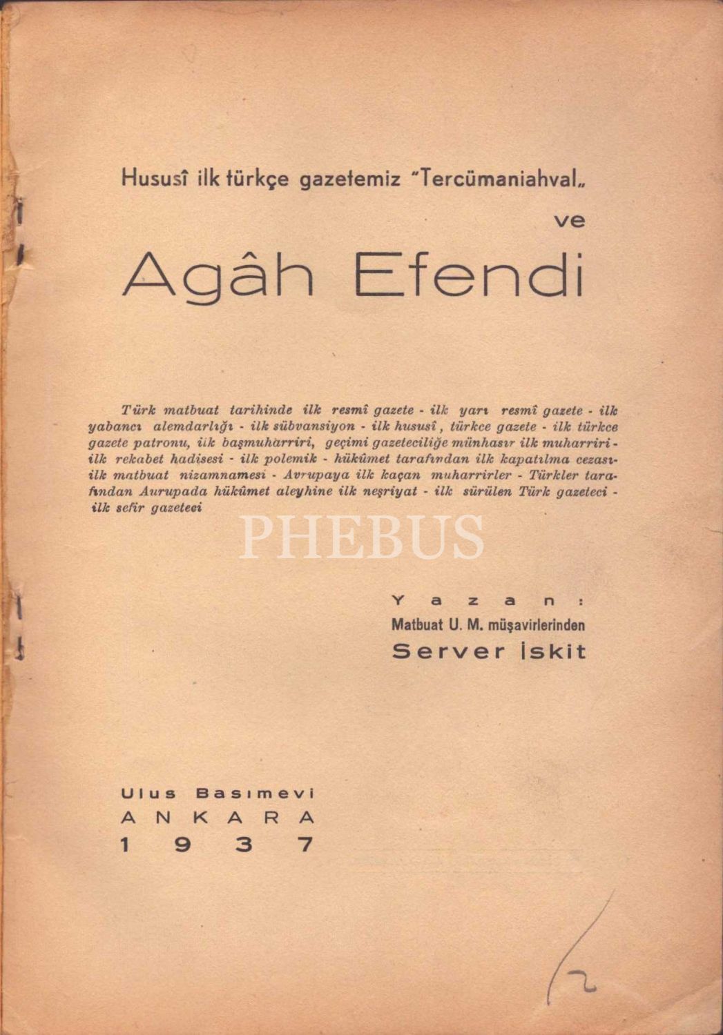Server İskit´ten ithaflı ve imzalı HUSUSÎ İLK TÜRKÇE GAZETEMİZ "TERCÜMANİAHVAL" VE AGÂH EFENDİ, Ulus Basımevi, Ankara - 1937, 56 sayfa, 17x24 cm