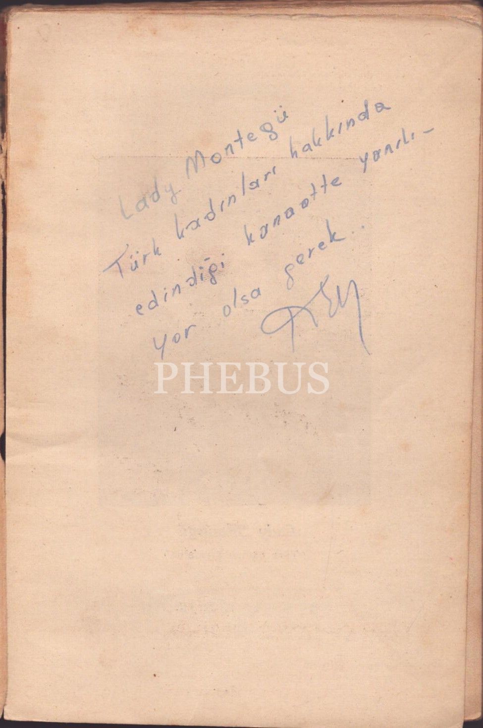 Ön kapak ciltten büyük ölçüde ayrılmış haliyle. Kitabın ilk sayfasında "Lady Montegü Türk kadınları hakkında edindiği kanaatte yanılıyor olsa gerek." şeklinde imzalı bir not mevcuttur.