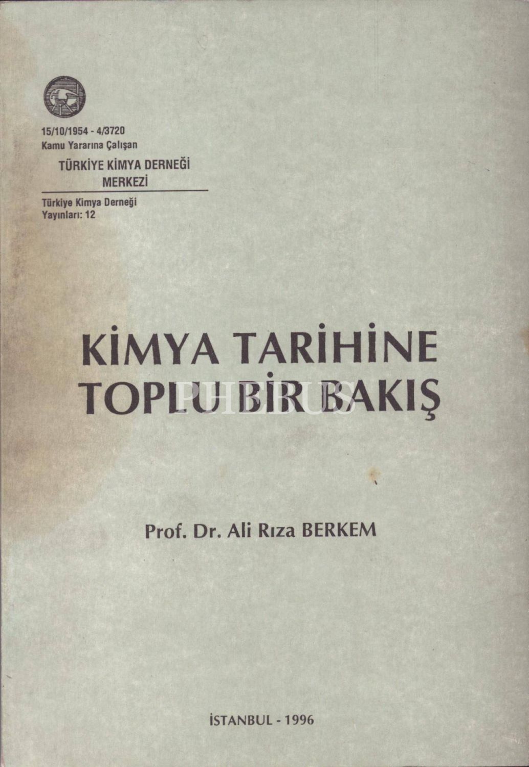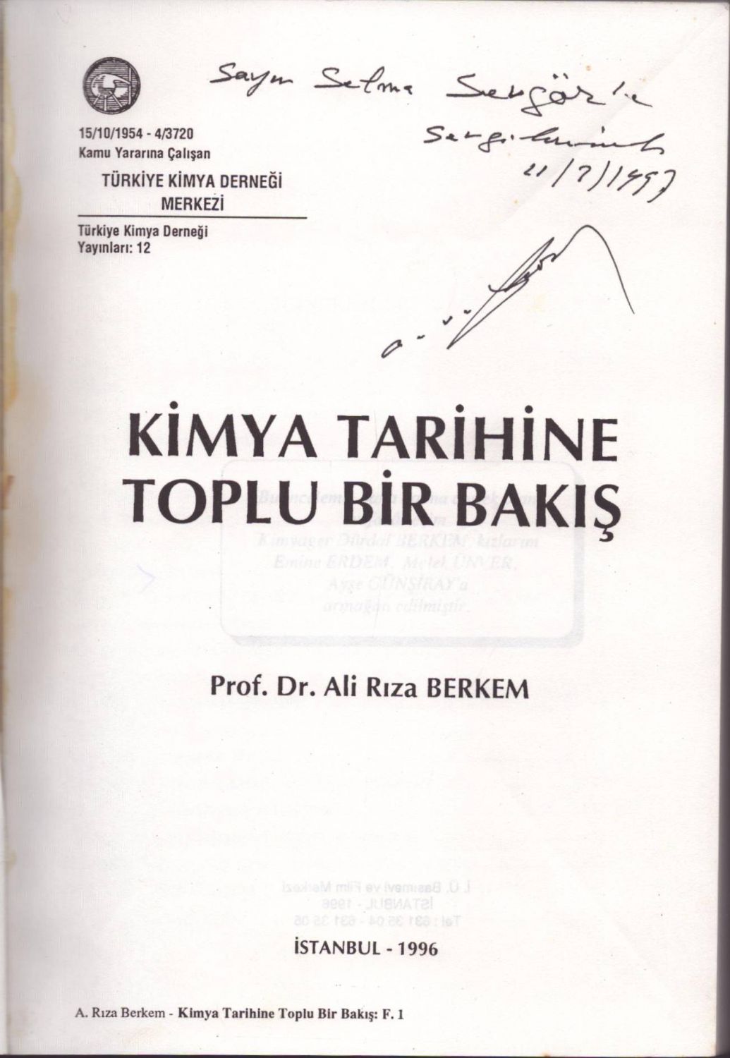 Ali Rıza Berkem´den ithaflı ve imzalı KİMYA TARİHİNE TOPLU BİR BAKIŞ, İ. Ü. Basımevi ve Film Merkezi, 1996, 242 sayfa, 17x24 cm