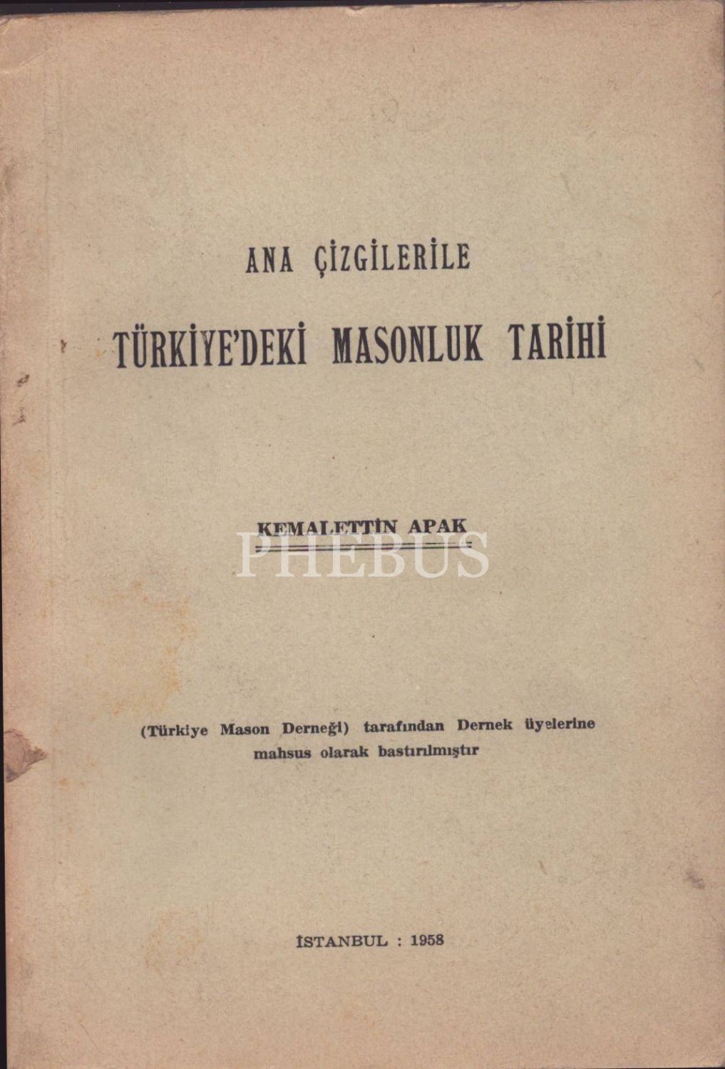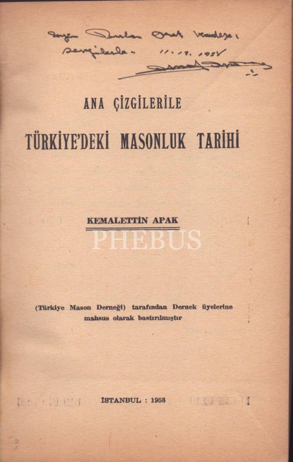 İthaflı ve imzalı ANA ÇİZGİLERİLE TÜRKİYE´DEKİ MASONLUK TARİHİ, Kemalettin Apak, İstanbul - 1958, 231 sayfa, 14x20 cm