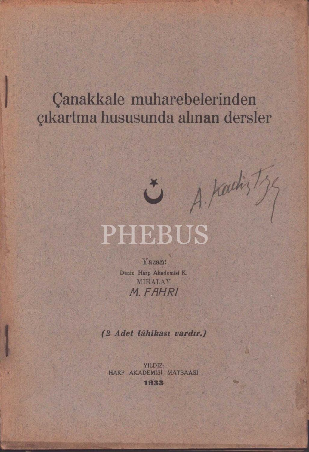 ÇANAKKALE MUHAREBELERİNDEN ÇIKARTMA HUSUSUNDA ALINAN DERSLER, M. Fahri, Yıldız: Harp Akademisi Matbaası, 1933, 37 sayfa, 17x24 cm