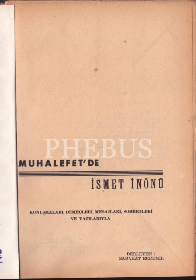 MUHALEFET´DE İSMET İNÖNÜ (Konuşmaları, Demeçleri, Mesajları, Sohbetleri ve Yazılarıyla), derleyen: Sabahat Erdemir, Ekicigil Matbaası, İstanbul - 1959, 412 sayfa, 17x24 cm