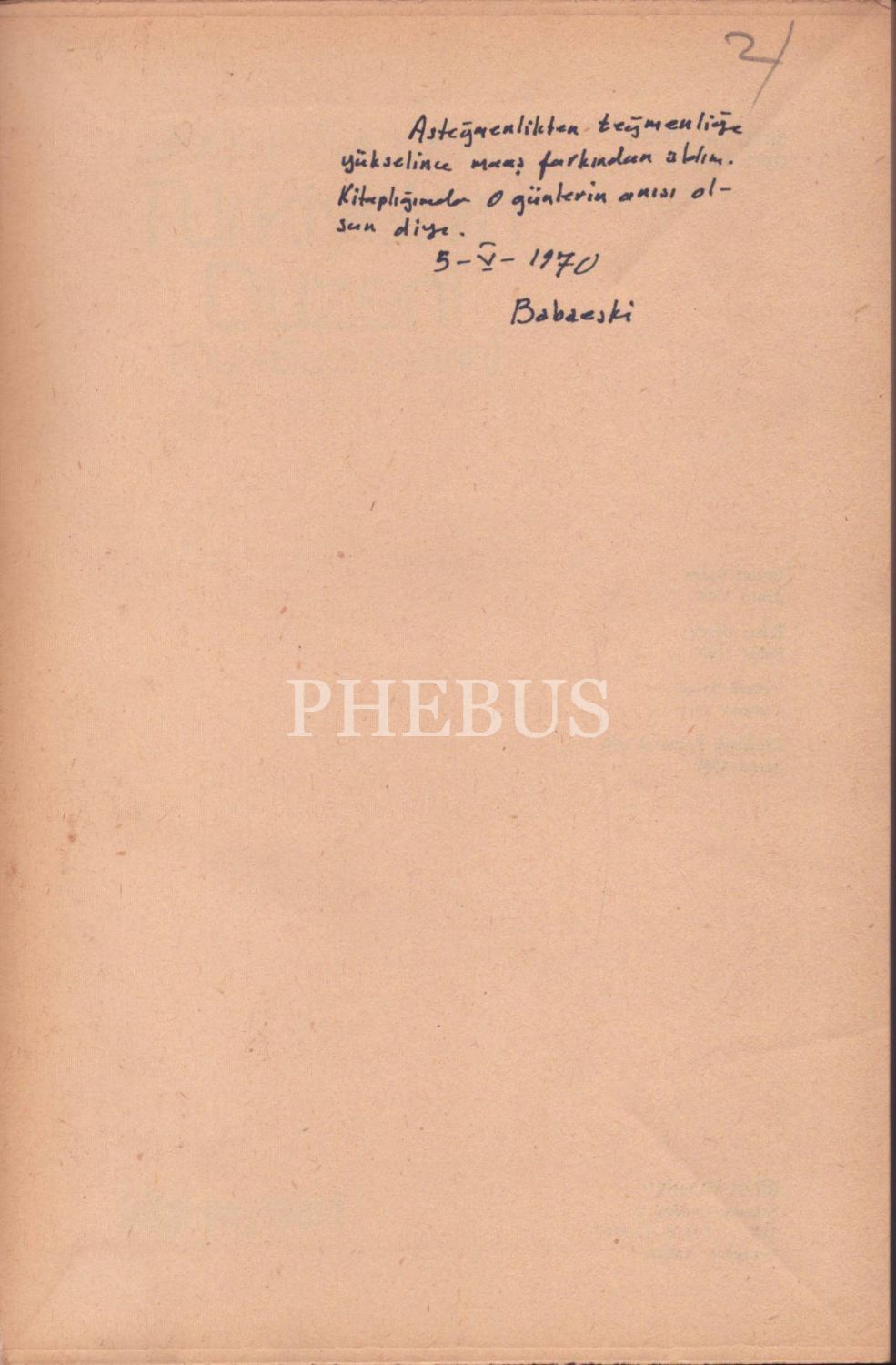 Kitabın ilk sayfasında "Asteğmenlikten teğmenliğe yükselince maaş farkından aldım. Kitaplığımda o günlerin anısı olsun diye. 5-V-1970 Babaeski" notu mevcuttur.