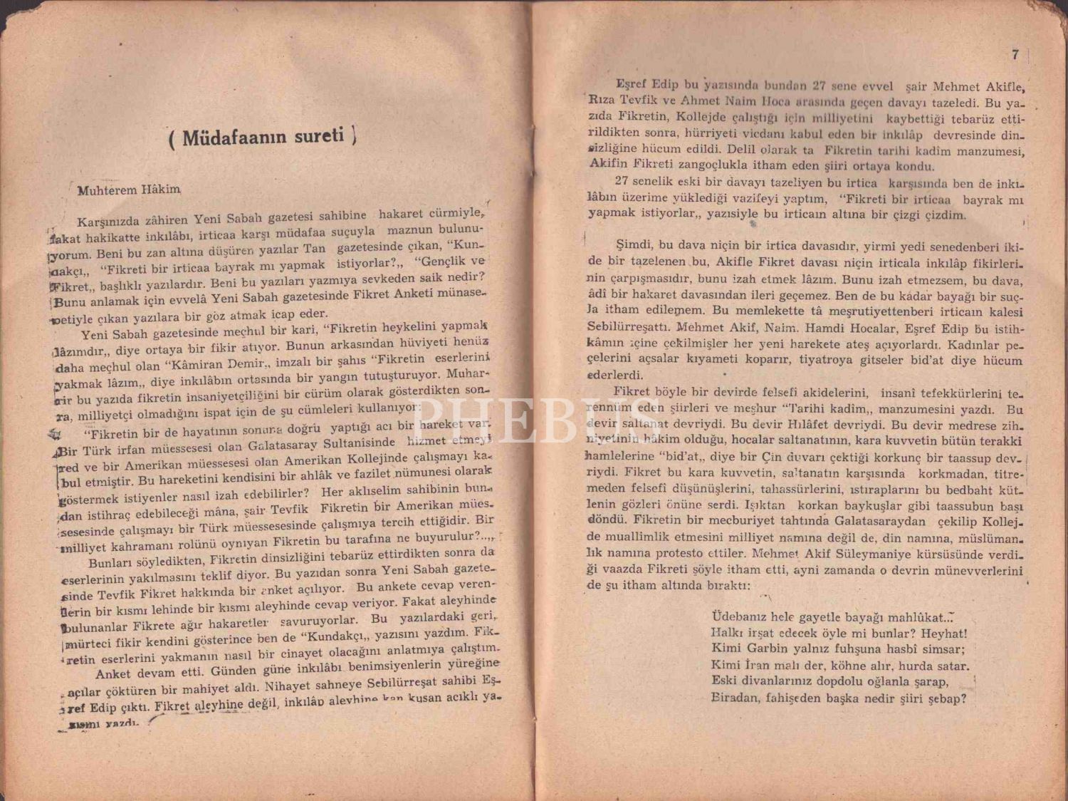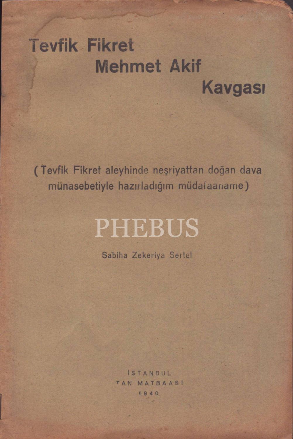 TEVFİK FİKRET MEHMET AKİF KAVGASI (Tevfik Fikret Aleyhinde Neşriyattan Doğan Dava Münasebetiyle Hazırladığım Müdafaaname), Sabiha Zekeriya Sertel, Tan Matbaası, İstanbul - 1940, 24 sayfa, 15x23 cm