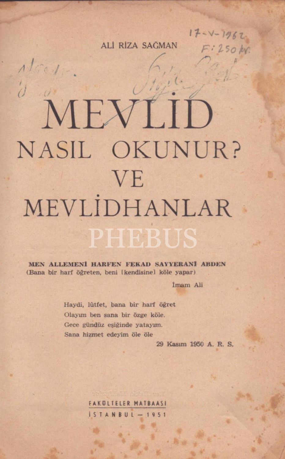 MEVLİD NASIL OKUNUR? VE MEVLİDHANLAR, Ali Rıza Sağman, Fakülteler Matbaası, İstanbul - 1951, 227 sayfa, 16x23 cm