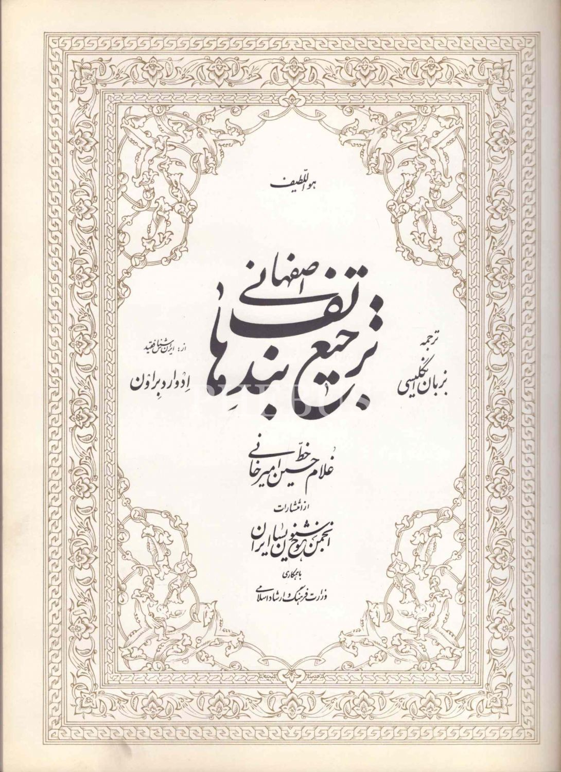 TERCİ-İ BEND-İ HÂTİF İSFAHÂNÎ (İngilizce Tercüme), Gulam Hüseyin Emirhâni hattıyla, neşreden: Encümen-i Hoşnevisân-ı İran, 1369, 38 s., 40 sayfa, 24x32 cm