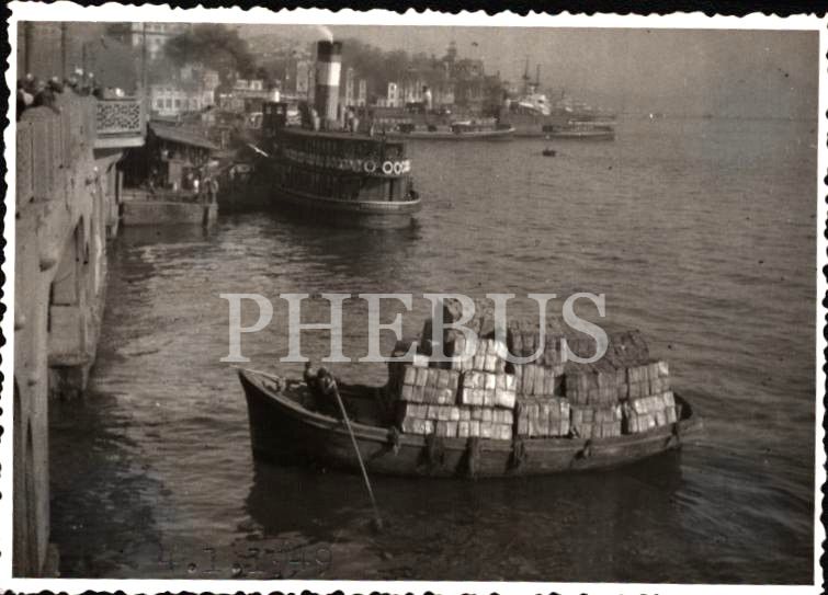 Galata Köprüsü altından yük geçiren mavnacılar, arkada iskeleye yanaşmış "Güzelhisar" vapuru görülmekte, 10x7 cm